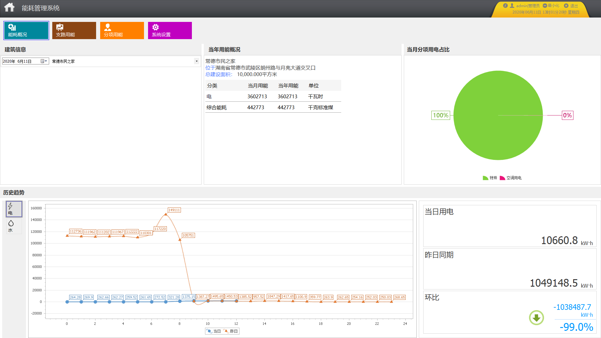 主頁(yè)面顯示該建筑的建筑圖片,建筑基本信息,建筑當(dāng)月分項(xiàng)用電餅圖和各種能源的消耗量。根據(jù)所選的建筑,對(duì)其建筑圖片進(jìn)行加載,可以選擇時(shí)間查看建筑能耗情況,選擇建筑或時(shí)間后自動(dòng)刷新,默認(rèn)為當(dāng)天。