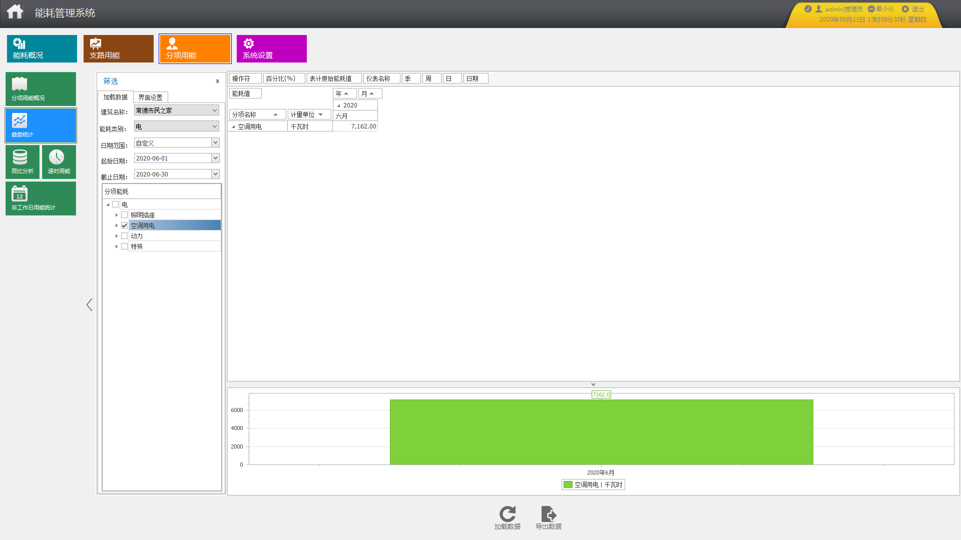 系統(tǒng)可以統(tǒng)計(jì)各分項(xiàng)某段時(shí)間內(nèi)逐日、逐周、逐月、逐季、逐年用能。可查看分項(xiàng)中各支路用能趨勢(shì),可根據(jù)已有的日期或者自定義時(shí)間進(jìn)行查詢,統(tǒng)計(jì)數(shù)據(jù)可導(dǎo)出至Excel。
