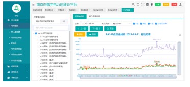 電力數(shù)據(jù)顯示變電所各回路的電力數(shù)據(jù)和曲線,包括電流、相電壓、線電壓、頻率、功率因數(shù)、有功功率、無功功率、視在功率等參數(shù),并可導出圖表。