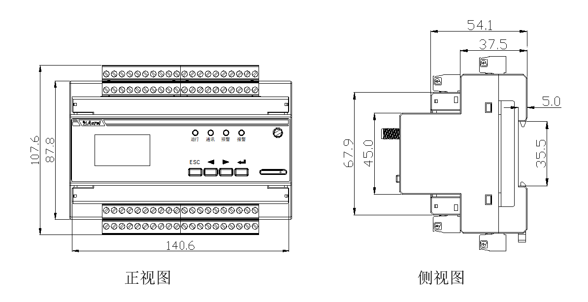 (2)剩余電流監(jiān)測(cè)儀外形與安裝尺寸如下圖所示。(單位:mm)