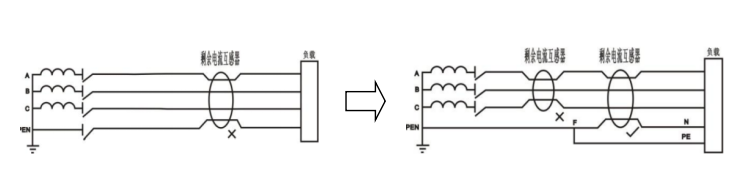 對(duì)于TN-C系統(tǒng),不能采用剩余電流繼電器。因?yàn)?PE 線和 N 線合一,若 PEN 線不重復(fù)接地,當(dāng)外殼帶電,互感器進(jìn)出電流相等,ASJ拒動(dòng);若PEN線重復(fù)接地,部分單相電流將流入重復(fù)接地,達(dá)一定值后,ASJ 誤動(dòng)。 需將TN-C系統(tǒng)改造成TN-C-S系統(tǒng),同TN-S系統(tǒng),再將剩余電流互感器接入TN-S系統(tǒng)中。