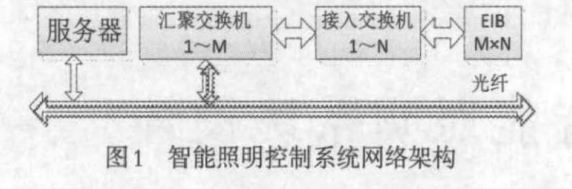 系統(tǒng)的組網(wǎng)采用支/干線模式,其中的支線連接由KNX控制總線完成,干線連接依托館所現(xiàn)有局域網(wǎng)實現(xiàn),該局域網(wǎng)連通館內(nèi)全部控制器,不用另行敷設電纜和重復定義系統(tǒng)管控方式。依托KNX/IP網(wǎng)關優(yōu)勢就能夠方便地實現(xiàn)將本系統(tǒng)接入校園主干網(wǎng),實現(xiàn)遠程的服務器連網(wǎng)。智能照明控制系統(tǒng)網(wǎng)絡架構如圖1所示。