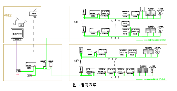智能照明控制系統(tǒng)組網(wǎng)方式靈活,擴展方便,當系統(tǒng)模塊數(shù)量較少、距離較近、范圍較小時,各設備以樹形枝狀延伸,構成支路系統(tǒng)智能照明控制系統(tǒng);當系統(tǒng)模塊數(shù)量較多、距離較遠、范圍較大時,用支線耦合器組成多條支路,構成區(qū)域智能照明控制系統(tǒng);當系統(tǒng)模塊數(shù)量很多、距離很遠、范圍很大時,用支線耦合器、區(qū)域耦合器等構成樓群智能照明控制系統(tǒng)。(見圖)