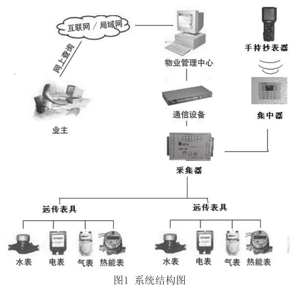 各多表采集裝置之間通過(guò)RS485總線(RVVP 2×1.0雙絞線)(TCP/IP、無(wú)線數(shù)傳模塊、GSM模塊、GPRS模塊等)或手持抄表器連接到小區(qū)管理處,通過(guò)RS485/232轉(zhuǎn)換器接至計(jì)算機(jī)管理系統(tǒng),采集模塊在接收到計(jì)算機(jī)的指令后,將數(shù)據(jù)向計(jì)算機(jī)管理系統(tǒng)發(fā)送或執(zhí)行計(jì)算機(jī)發(fā)出的遠(yuǎn)動(dòng)指令。計(jì)算機(jī)管理系統(tǒng)可以對(duì)每個(gè)用戶(hù)冷水表、熱水表、中水表、純凈水表、電表、氣表、熱能表進(jìn)行實(shí)時(shí)數(shù)據(jù)采集,可以設(shè)置各表具的初始值,可以設(shè)置單價(jià)和計(jì)量系數(shù),可以隨時(shí)進(jìn)行數(shù)據(jù)查詢(xún)、統(tǒng)計(jì)和計(jì)算管理,可以查詢(xún)、打印交費(fèi)情況和收據(jù),業(yè)主可以通過(guò)園區(qū)網(wǎng)實(shí)時(shí)查詢(xún)表具數(shù)值和應(yīng)交費(fèi)用。系統(tǒng)具有權(quán)限設(shè)定功能,操作員和管理員可設(shè)定不同的權(quán)限等級(jí)。