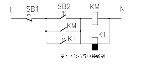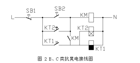 這種抗晃電方式,是目前某化工廠普遍使用的一種方式,使用兩個時間繼電器,其接線方式如圖2所示,當(dāng)電網(wǎng)發(fā)生波動時,接觸器的線圈失電,接觸器的輔助常開接點(diǎn)KM斷開,時間繼電器KT1的輔助常開接點(diǎn)延時斷開。電網(wǎng)恢復(fù)時,通過時間繼電器KT1斷電延時斷開的輔助接點(diǎn)(KT1)接通時間繼電器KT1和KT2的線圈,KT2輔助接點(diǎn)得電延時閉合接通接觸器KM線圈,實(shí)現(xiàn)電動機(jī)的自啟動。B類、C類時間分別整定為KT1=4s,KT2=6s;KT1= 4s,KT2=8s。
