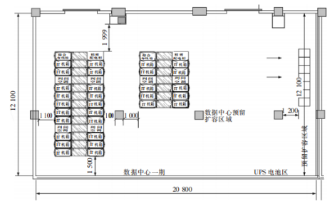 某煤礦模塊化數(shù)據(jù)中心的平面配置如圖 1 所示,某煤礦數(shù)據(jù)中心實景如圖 2 所示。 某煤礦數(shù)據(jù)中心共采購兩組 IDS 2000 雙 排模塊化數(shù)據(jù)中心,西側(cè)模塊數(shù)據(jù)中心包含一體化配電柜、行間空調(diào)、UPS 電源、雙回路電源輸入柜、UPS 電源輸出柜、空調(diào)電源柜,東側(cè)模塊數(shù)據(jù)中心包括配電柜、行間空調(diào)、中控、監(jiān)控和 ODF 配線柜,其中還在數(shù)據(jù)中心機房預(yù)留有擴(kuò)容區(qū)域。